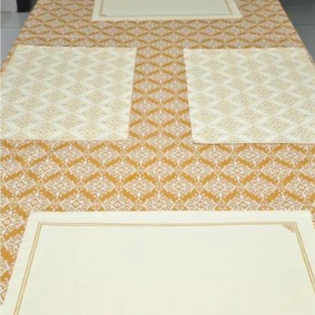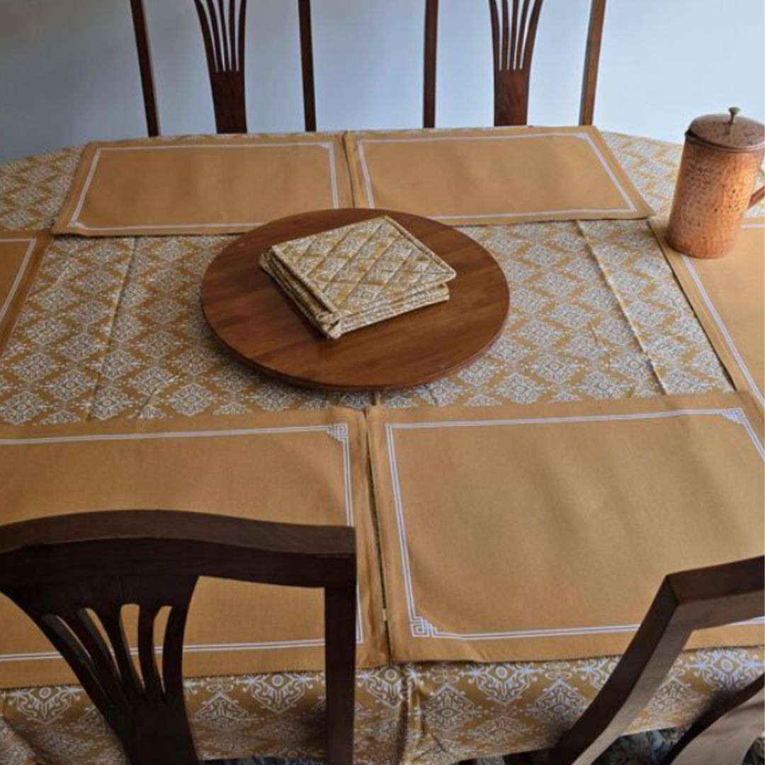 Introducing "Jaisalmer," a beautiful addition to our stone-inspired collection of table linens. This design is reminiscent of the golden sands and grand architecture of Jaisalmer, featuring intricate patterns in a warm ochre hue. Screen-printed on high-quality cotton, it is both wipeable and anti-slip, ensuring a blend of elegance and practicality. Perfect for adding a touch of Indian heritage to your dining table, this piece is a celebration of traditional craftsmanship with a modern twist.