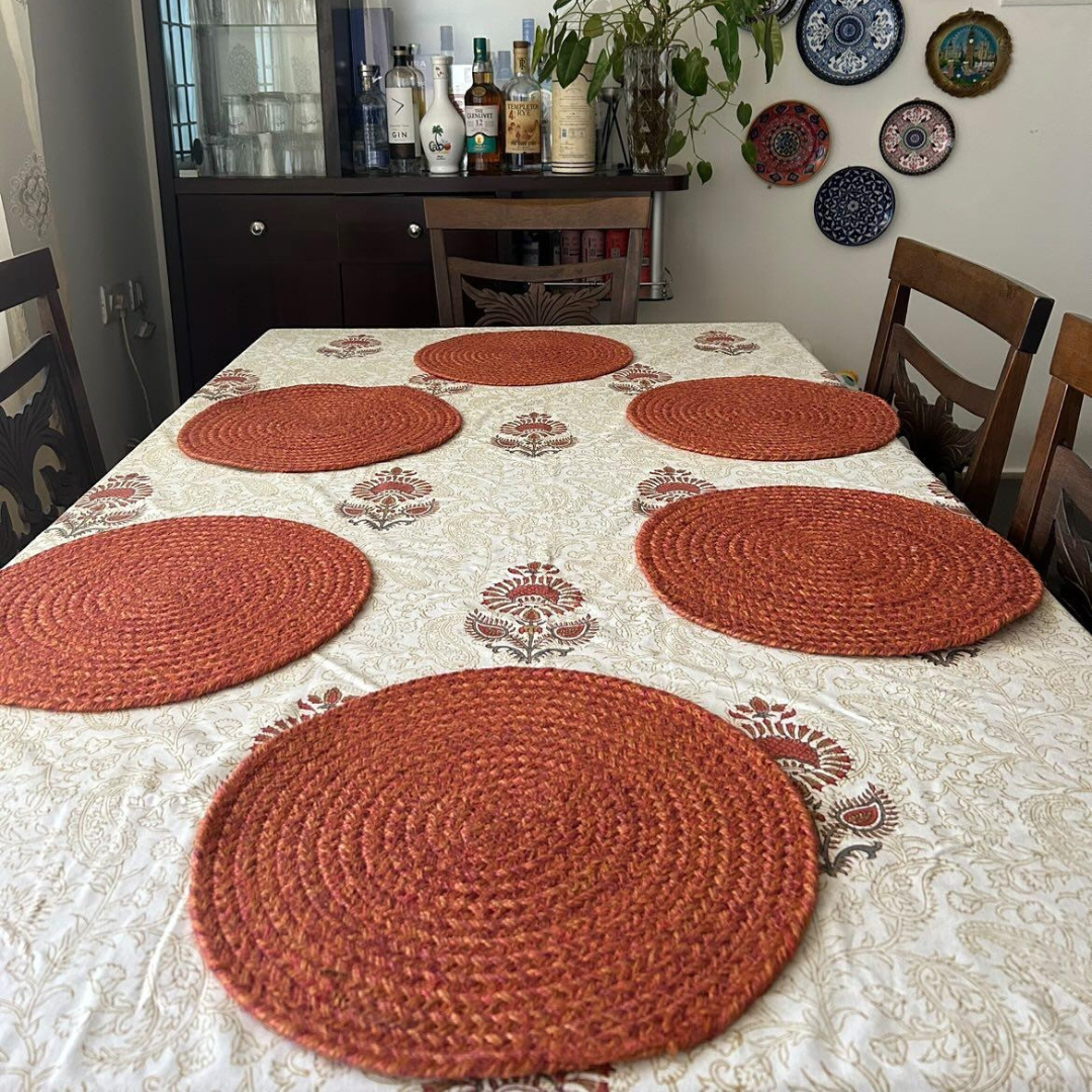 A minimal ochre Jaal pattern with festive tangerine motifs - This is just perfect for those looking for a muted festive look. Tangerine pairs with our festive coral placemats to take the whole look up a notch.